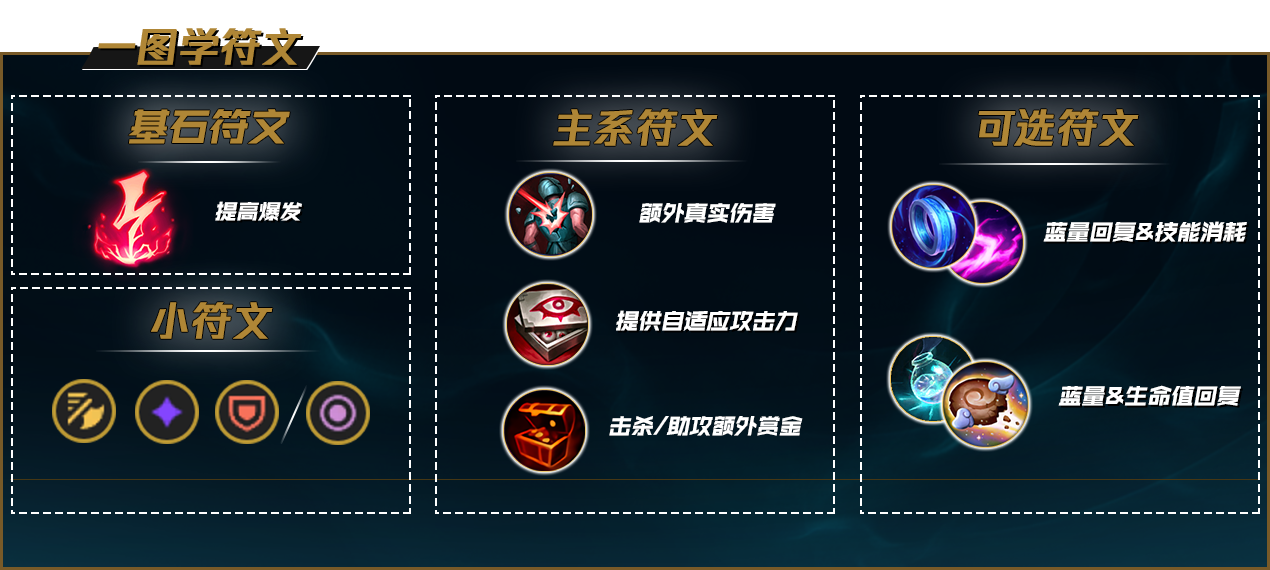攻击速度、自适应之力、护甲/魔抗根据对位来选择。选择攻速线上补刀更容易,也更容易叠W的被动。