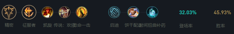 征服者可以使杰斯快速叠满攻击力同时获得部分吸血效果,凯旋参与击杀后可以回复部分血量,欢欣提升自身的攻速,致命一击对低血量英雄造成更高的伤害。副系饼干配送和时间扭曲补药大幅度提升杰斯的线上续航能力。