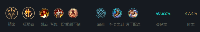 征服者可以为刀妹提供极高的攻击力加成,同时获得部分血量回复效果。凯旋为刀妹参与击杀之后会返还部分血量,韧性提升刀妹的抗减速、晕眩等削弱自己状态的能力,坚毅不倒使在低血量状态下对敌方英雄造成更高的伤害。副系神奇之鞋使刀妹会提供免费的鞋子,饼干配送提升刀妹线上续航。