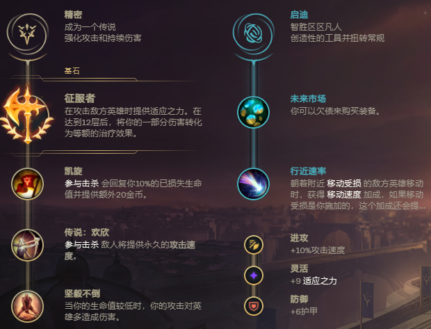 基石符文征服者,普通R和觉醒R都可以叠加征服者,RAAR(觉醒)AA即可触发,而且乌迪尔打团期间大部分情况都是在开R烫人。AOE能力十足,配合征服者收益最大。欢欣和韧性根据对面阵容控制的多少来选择。副系行进速率配合R的减速,可以一直追人,效果很好。另一个点未来市场保证第一次回家能出CD鞋。