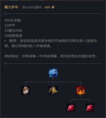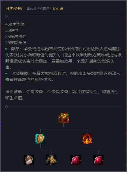第二件装备我们选择日炎圣盾,也可以选择霜火护手,选择霜火护手的情况在上面提到过,就不继续赘述。日炎的普攻叠加献祭效果无论是对拼还是提供的韧性和减速抗性都特别适合卑尔维斯。