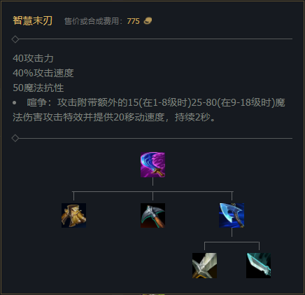 智慧末刃的攻速和攻击特效,还有魔抗很适合作为卑尔维斯的魔抗装备进行选择。如果面对AP爆发比较高的阵容,我们也可以选择大饮魔刀,不光拥有魔法盾,还有全能吸血效果,让卑尔维斯生存能力更强。