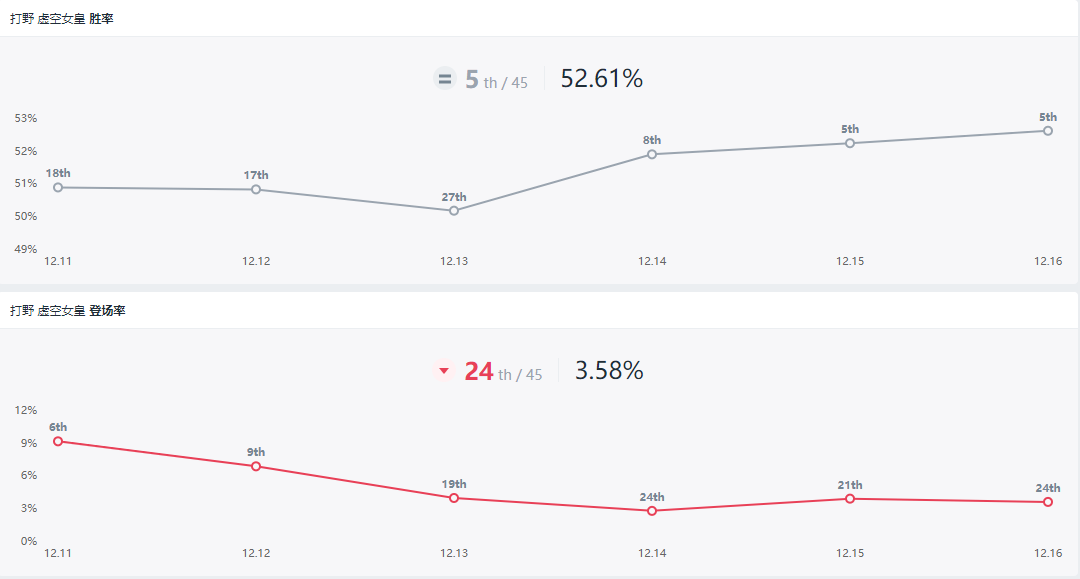 最后,卑尔维斯在韩服胜率相对较高,但是国服胜率和登场率都是比较低的,韩服更偏向于运营和节奏资源团,更适合卑尔维斯,而国服一直没有一个合适的属于自己的玩法,所以胜率还比较低迷。
