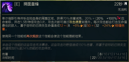 选择主E有两点,我们可以先看一下Q技能的提升效果,会对小兵提供额外伤害,对于我们打野卑尔维斯来说效果并不是很重要。