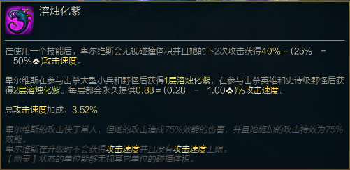 其次卑尔维斯不会通过升级获得攻击速度加成,但是击杀大型小兵和野怪后会获得一层被动,击杀英雄和史诗级野怪会获得两层被动。被动会为卑尔维斯提供额外攻速。