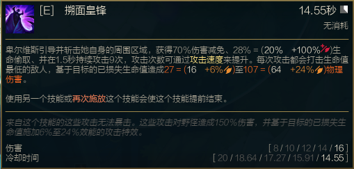 而主E道理就十分明显,首先冷却时间大幅降低,E技能的减伤和吸血效果对于卑尔维斯十分重要,减少了6秒的冷却时间我们的容错率将会大大提升。