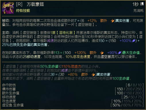 当击杀峡谷先锋或者纳什男爵时,真实形态会持续180秒,并且附近阵亡的小兵将会变为【虚空鱼】,虚空鱼拥有50%小兵血量和110%小兵攻击力。