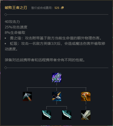 第一件装备选择破败,我们的核心装备是破败加日炎。并且第一件装备破败可以加强你的对拼能力,同时三次攻击后触发攻击特效还有额外的移动速度,特别适合卑尔维斯留人。