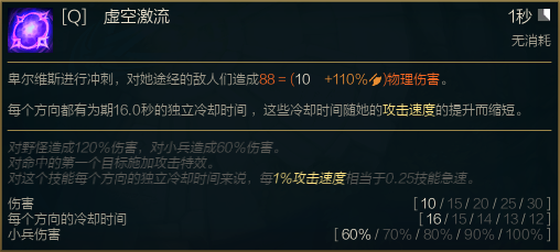 虚空女皇的机动性是特别强的,Q技能提供的位移虽然方向是几乎固定的,但是有了W的刷新,其实并不缺少移速。