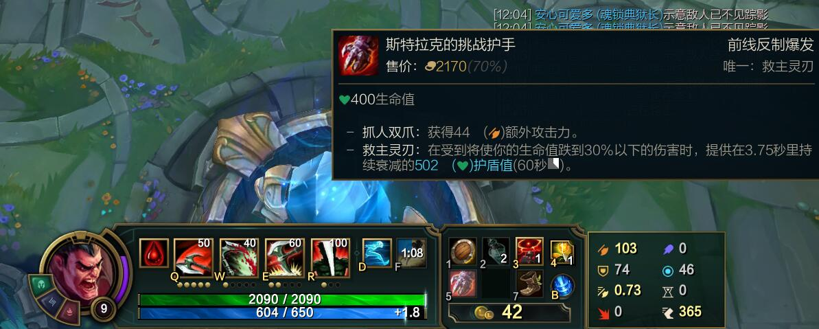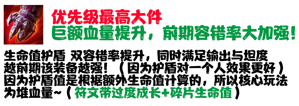 需要注意的是血手根据额外生命值来提供护盾,所以符文方面带上了生命值和过度成长,后续出装也围绕血量展开。