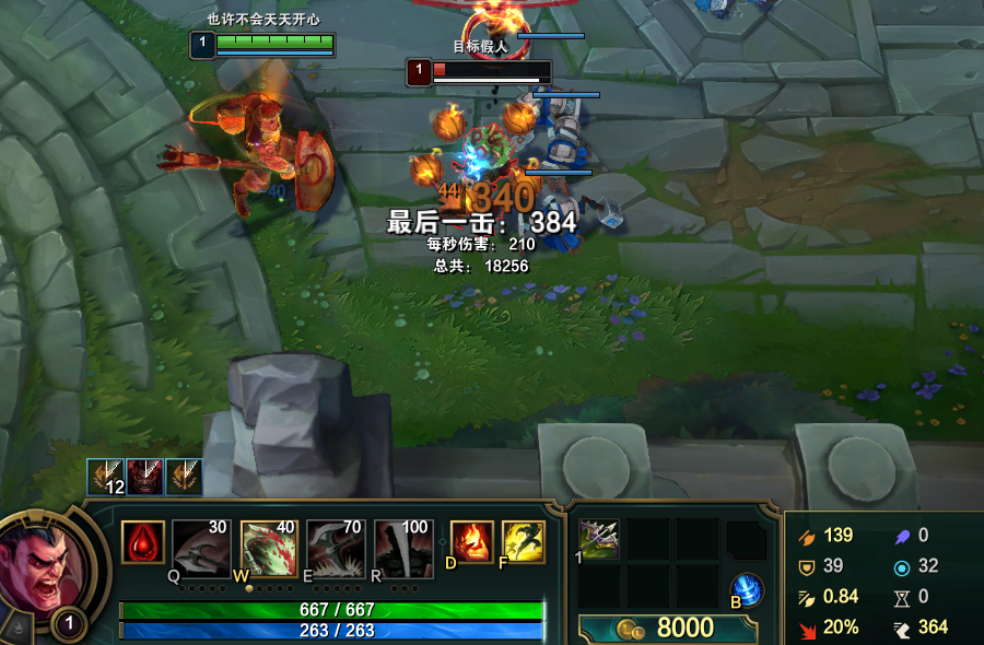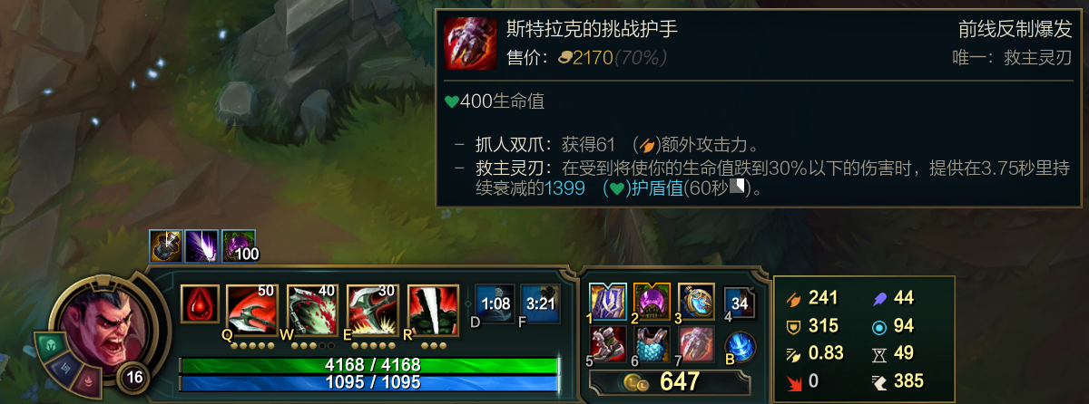 血量是德莱厄斯最重要的属性,前期只有先挨打,叠满血怒才有后续输出!所以血量越多越好!(注意:德莱厄斯线上打不过任何致命节奏型英雄,特别是永恩)