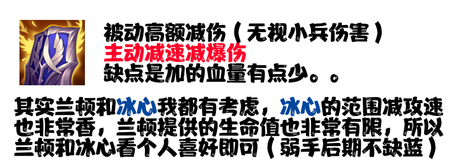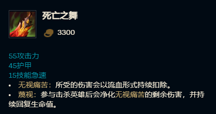 缺点:价格极其昂贵!合成较不平滑,有钱出死舞还不如出兰顿,虽然击杀回复确实很香~但回的血肯定没有防御装备直接提供的血量靠谱,除非优势真的非常大,不然同经济情况下不如纯防御型装备。