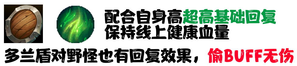 出装方面出门选择多兰盾配合复苏,强化线上回复(多兰盾一级单偷敌方BUFF不伤)