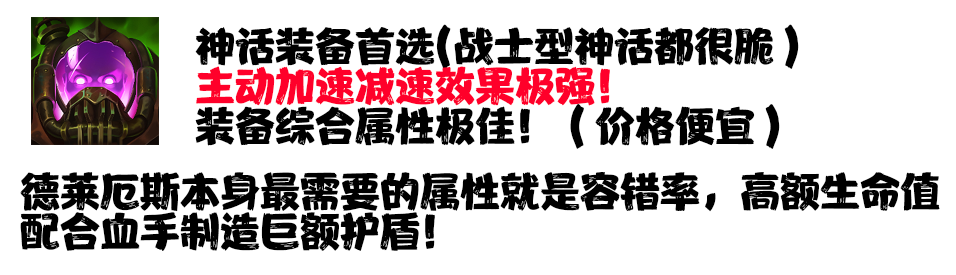 所有的战士神话都有一个通病,那就是极其昂贵的价格(以及非常辣鸡的合成路径)如果再考虑死亡之舞等一系列昂贵的装备,可以说是非常非常拖节奏了。。。同经济的情况下战士装备收益远远不如坦克装备,德莱厄斯团战必须能抗住敌人的伤害才能雄起,先当孙子后当爷!