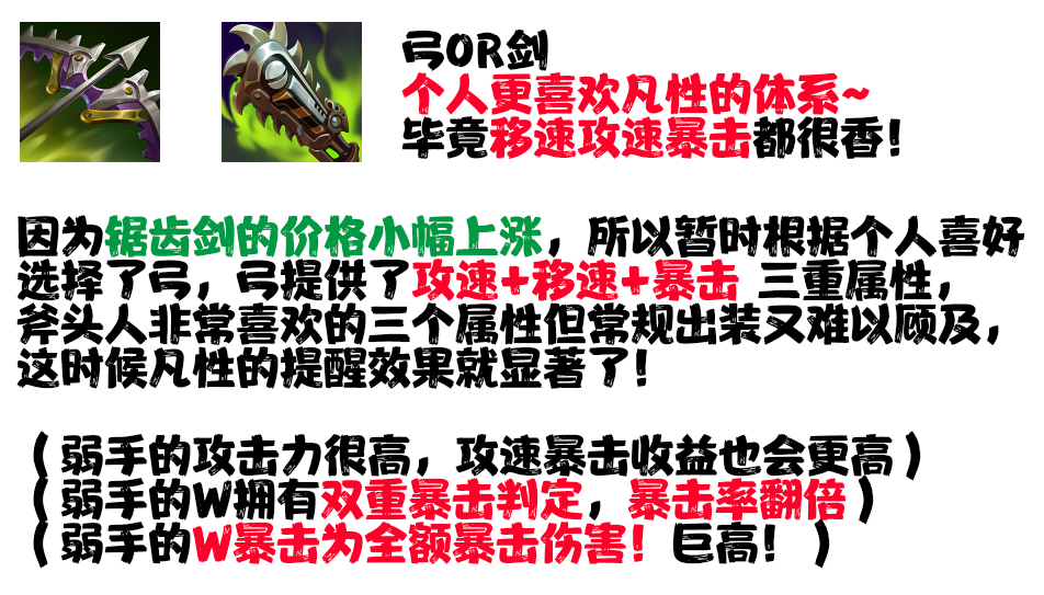 虽然但是,弱手也没有其他的暴击装可以选择了。。。并不鼓励刻意去玩暴击流。
