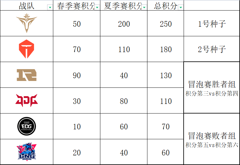 这里还可以分享一个TES一个BO5不赢都能进世界赛的特殊情况,假设TES季后赛连输2个BO5止步第四名,世界赛积分定格在130,如果最终是V5夺冠,EDG夺得亚军,JDG获得第三名,其他战队随意。此时TES的世界赛积分依旧是第二,能拿到2号种子直通世界赛。