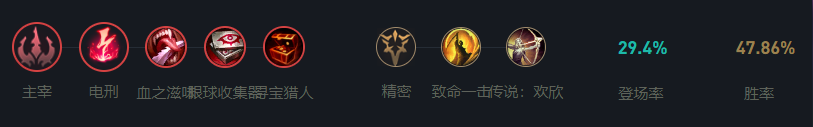 电刑可以使凯南在短时间内打出爆发伤害,血之滋味弥补凯南在线上无血量回复的不足,眼球收集器提升凯南的法强加成,寻宝猎人可以使凯南在参与击杀后提供金币加成。副系致命一击对低血量英雄造成极高的伤害,欢欣提升凯南的攻速,提升凯南线上消耗能力。