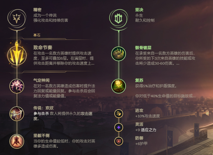 现在上单狼基本只有致命节奏这一个符文,狼人RQ都可以叠加致命节奏,配合破败和W的攻速可以很快叠满。无论是对线all in还是中期打架,致命节奏的效果都很好。对线缺蓝,气定神闲基本必带。副系根据对线和团战需要选择小符文即可