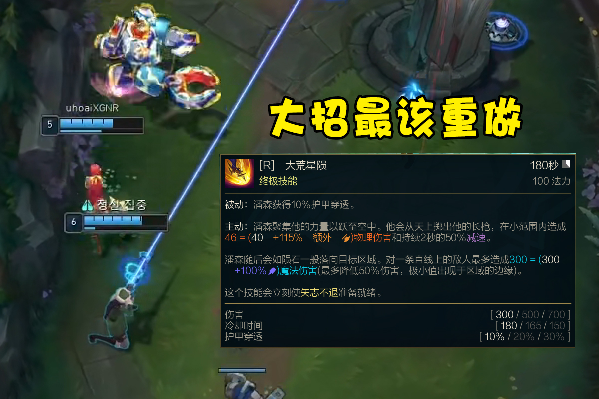 个人觉得女警最废的就是大招了,对拼的时候就像个摆设,伤害低就算了,关键还会被挡,基本只能用来打poke,可以考虑像潘森大招那样增加百分比穿甲,前期大家护甲都不高,百分比穿甲收益很低,不会让女警对线太强,又可以弥补她中期伤害不足的问题。