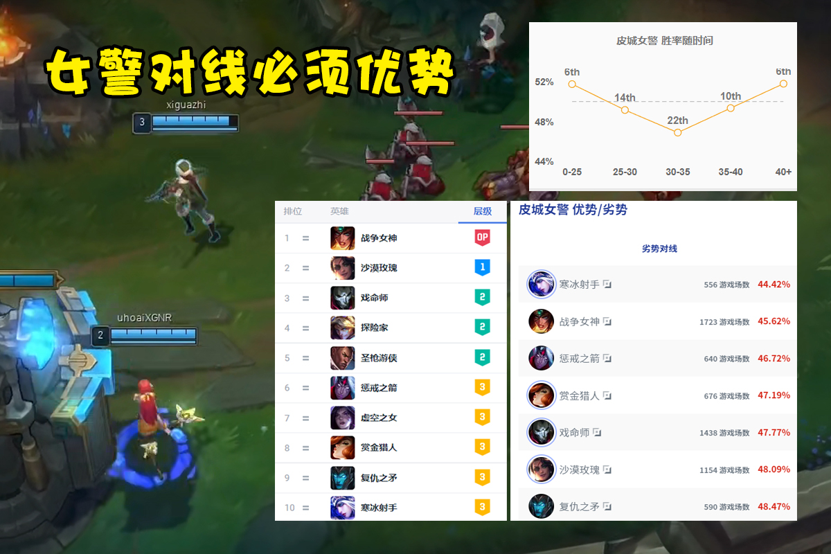 女警是一个标准的“U型”ADC,对线期仗着射程远可以欺负一下对手,可一旦被对手稳住没有带起推塔节奏,进入中期后就会非常乏力,且这个疲软期持续的时间还不短,至少得出到三件套才有战斗力,正常怎么也得30分钟了,简而言之,女警选出来就必须打出线优才有用,可看了一眼对位数据,当前版本大部分主流ADC对线都不虚女警(尤其是大热门轮子妈,靠推线速度就能完克女警),别说优势了,能均势就已经谢天谢地了。