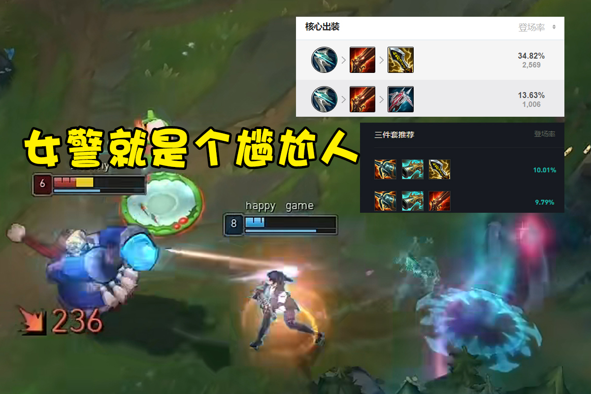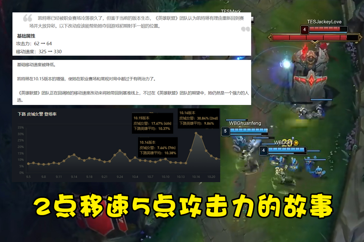 既然如此,设计师为何不加强一下女警呢?由于前期长手压制力的存在,设计师不敢给女警太多加强,不知道大家有没有听过“2攻击力5移速”的故事,设计师在10.15版本中给了女警这些“平平无奇”的属性,没想到直接让她的对线强度上升了一个档次,登场率从7%涨到了30%,最后不得不紧急回调,在这之后,设计师每次改动女警都非常小心,生怕又将其变成怪物。