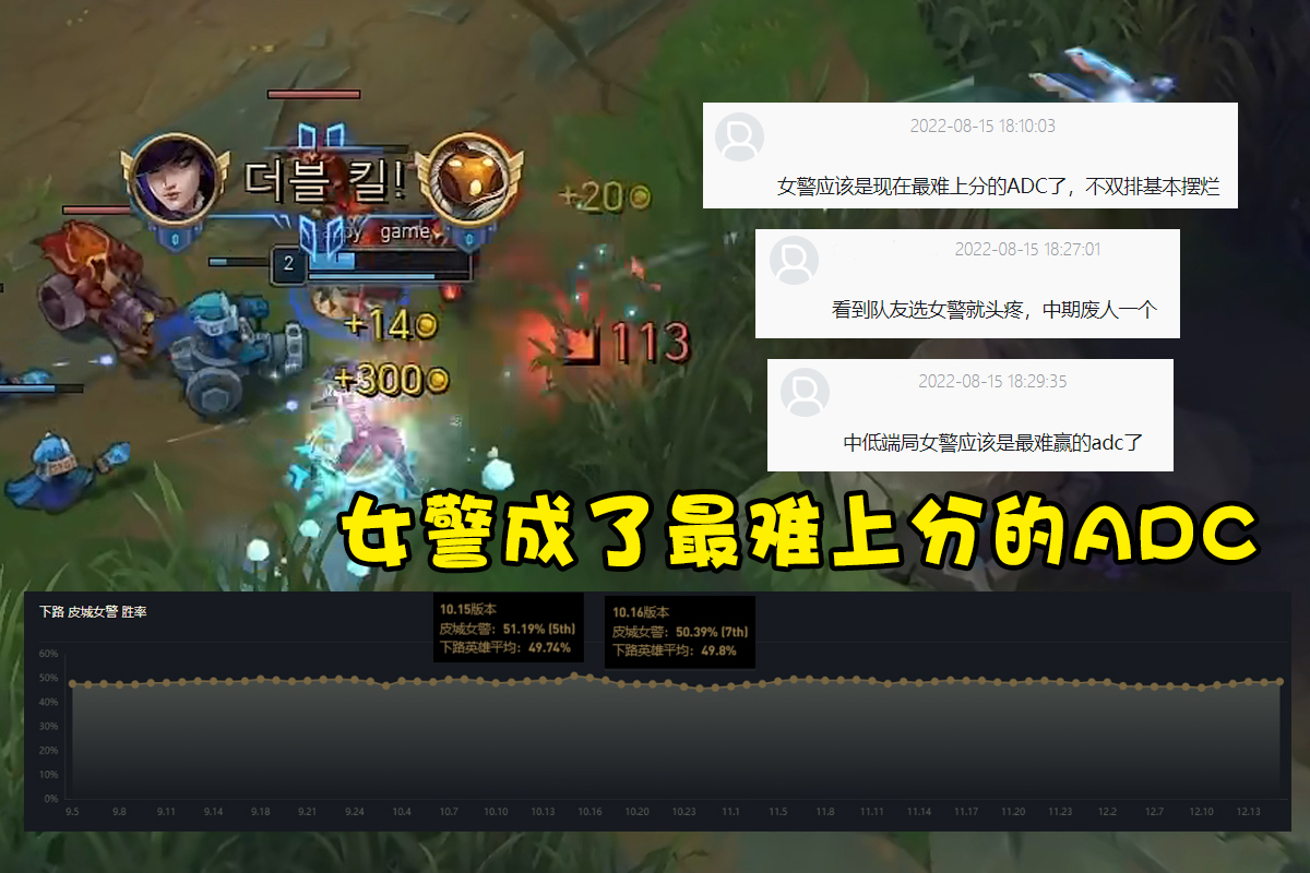 看了很多玩家对女警的评价,总结起来就是三个字“很难赢”,这并非是空口白话,根据路人局数据显示,从9.5版本至今女警只有在10.15和10.16两个版本中的胜率超过了50%,足以说明这个英雄不适合普通玩家用来上分。