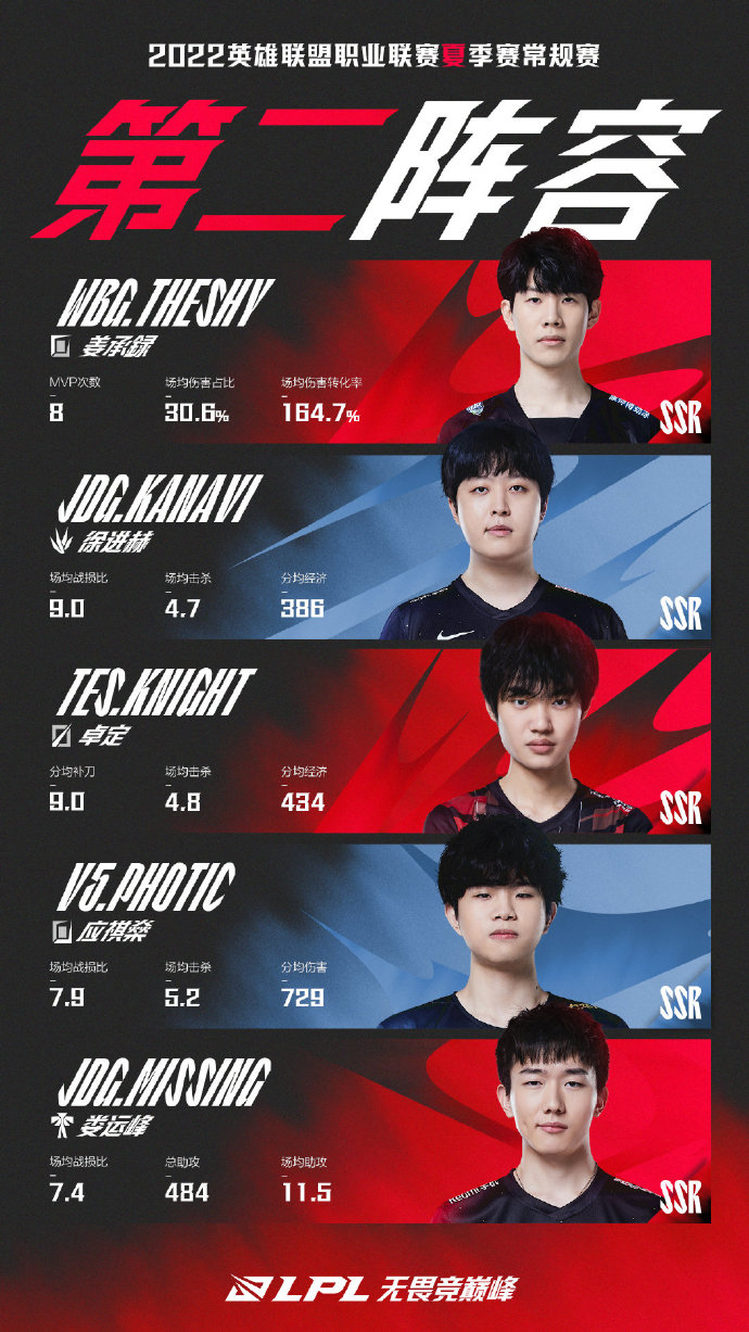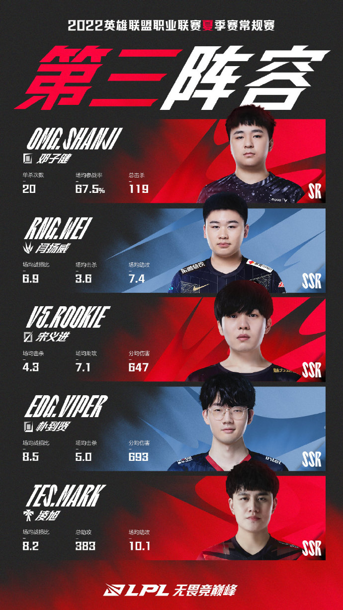 再次恭喜TES.Tian获得2022LPL夏季赛常规赛MVP荣誉、OMG.shanji获得最佳新秀荣誉,同时恭喜以上入选夏季赛常规赛第一、二、三阵容的选手,期待各位选手在之后的征程中有更精彩的表现。2022LPL夏季赛季后赛已经开启,精彩赛事不容错过,LPL无畏竞巅峰!