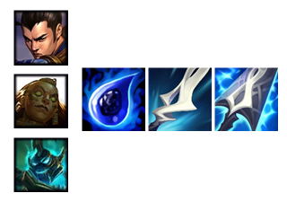 3.在对面脆皮很多点控很多没A人环境的情况下(如有莫甘娜、光辉、寒冰等英雄)有两套出装思路,1是出穿甲装或转AP(尽量不要让己方伤害类型过于单一),2是狂堆生命偷取出守护者战锤+盾弓+饮血,前者输出环境会更好,后者尽管还是吃不了控制但只要有兵线也能一直保持不错的血量: