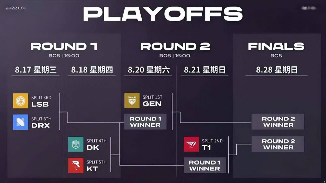 LCKS12夏季赛已经结束了,饱受期待的T1战队并没有获得第一名,期待他们在季后赛王者归来,那么LCKS12夏季赛季后赛赛程安排是什么?下面就给大家带来LCKS12夏季赛季后赛赛程表。