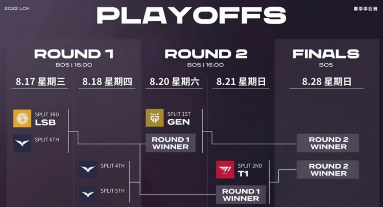 LCK2022夏季赛季后赛快开始了,而目前官方已经公布了季后赛的赛程,季后赛在8月17日开始,每天进行一场,下面就给大家带来LCK2022夏季赛季后赛赛程表。