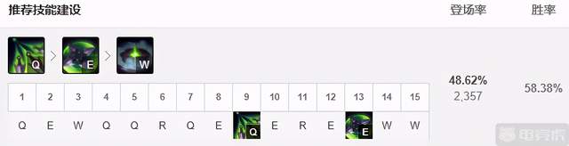 技能选择方面选择中规中矩的主Q副E技能,虽然Q技能遭到几次削弱但是我们的主要伤害还是利于Q技能打出的,而且对于升级可减少冷却时间的技能我们一般都是选择尽快升级以减少冷却增加英雄的操作性。