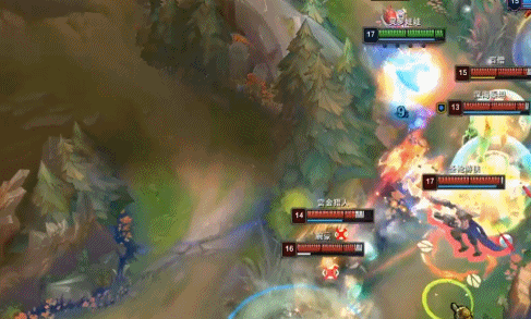 顺风的话我们直接R起手开团,然后冲入人群中开W。W隔断对方AD先打他们前排,2段R和3段R尽量打到前排的同时也能穿到后排。留个EQ上去直接剪AD。