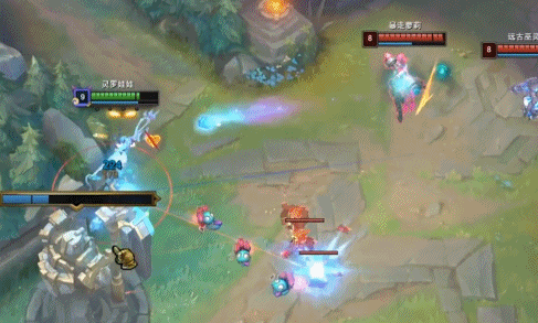 这时我们带着A残血小鸟的两层被动使用QE过墙打到三狼,接着一直A大狼有满层Q就用。在三狼残血的时候E到蓝BUFF,朝着后方使用Q技能击杀全部小狼。