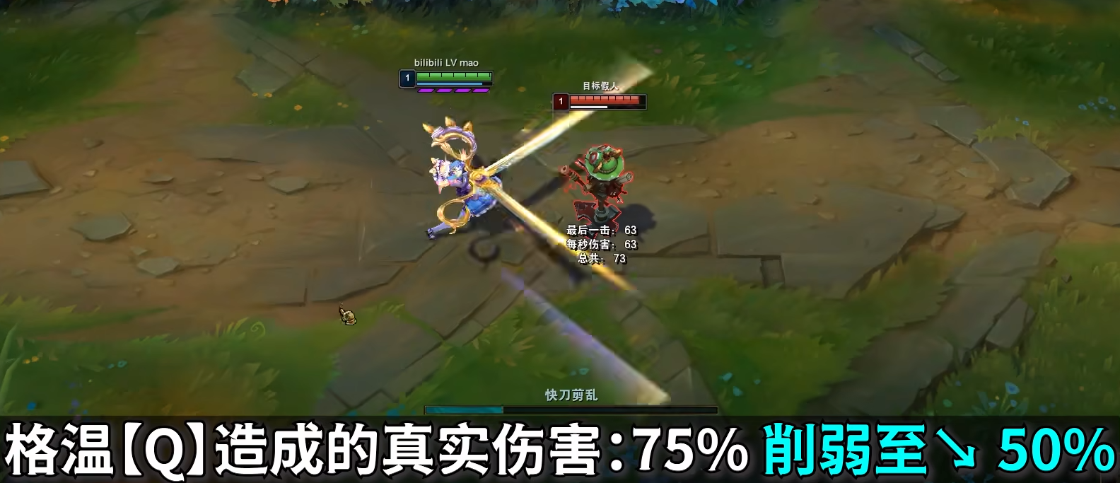 同时在下个版本当中,格温还要迎来一次削弱。【12.15】格温Q技能中心区域真实伤害转换由75%降低至50%,这个削弱在【12.13】版本也进行了一次削弱,将真实伤害的转换从100%变成了75%,相当于真实伤害直接砍了一半。