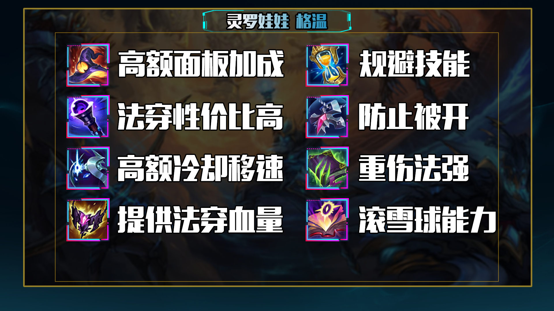 随后我们来介绍一下法穿棒,很多人会感觉法穿棒并不适合格温。但是现在的对局当中魔抗都很高,如果对手的魔抗超过了90的时候法穿棒的收益则会比帽子高,所以作为第四件或者第五件装备选择法穿棒是一个很好的选择。