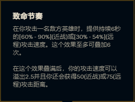 而且在单位时间内无论是前期还是中后期,征服者的伤害都完全碾压致命节奏,虽然致命节奏会让你A的更快,但是并不会让你的伤害高出很高,尤其在下个版本削弱了转换比之后,对于Q技能的面板输出需求将会更加直接,致命节奏则像是弹棉花一样。