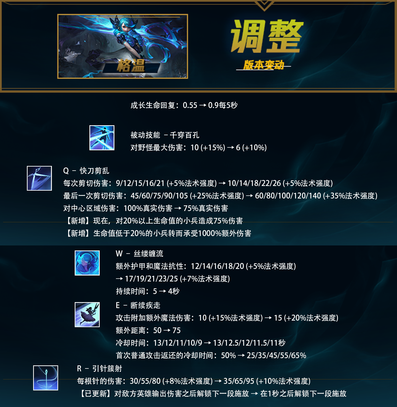 格温由于在职业赛场上过于强势,所以进行了一次不小的削弱,其中Q技能降低了清线能力,而被动技能降低了刷野能力。这让无论是上单还是打野格温都有了不小的影响。