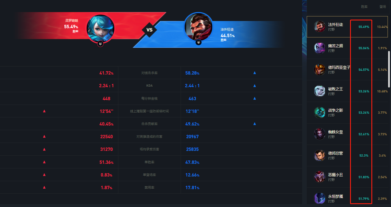 低于50%胜率的英雄仅有以下几名,面对其他打野都超过50%胜率。