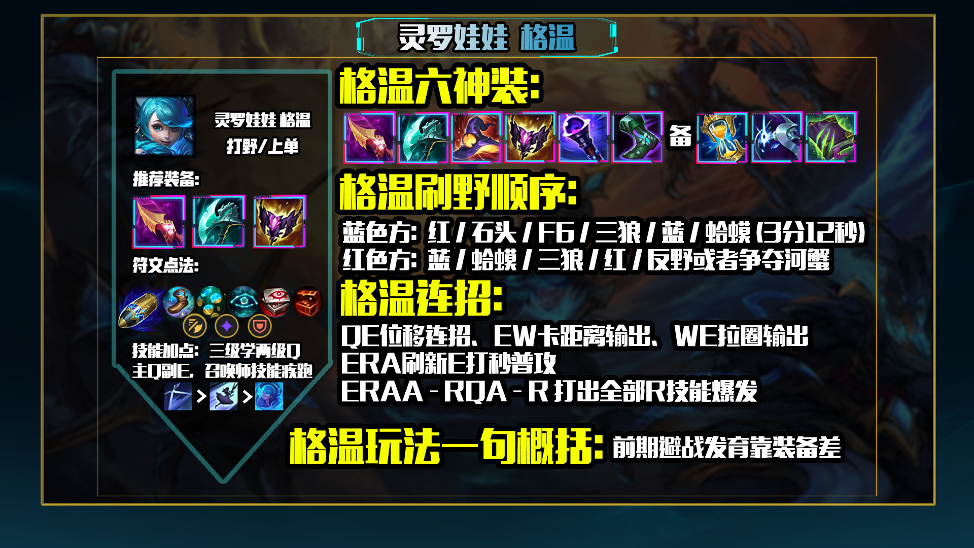 随着lol新版本的到来,很多人不知道改动了啥,现在又该如何玩,怎么出装,天赋点什么,英雄的改动,现在有我跟大家讲解一下在12.14版本格温玩法推荐。