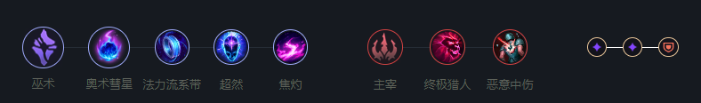 寒冰射手的符文也很关键,这里推荐还是以彗星焦灼消耗为主,法力流系带点出来防治缺蓝,超然必点加技能急速。副系必须点出主宰的终极猎人可以减少大招CD。另一个可以点恶意中伤。另一种更加激进的玩法就是主系主宰点出丛刃加强前期压制力,副系巫术点出法力流系带和超然,丛刃的三次快速攻击在前期可以打出很不错的压制效果。