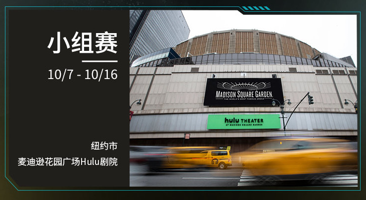 而小组赛则是从10月7日开始,一直持续到10月16日,比赛地点则是安排在了纽约市的麦迪逊花园广场Hulu剧院。四分之一决赛则是从10月20日一直持续到10月23日,地点同样是在纽约市的麦迪逊花园广场Hulu剧院。