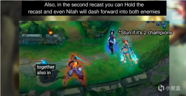 第二种是Nilah将捆绑的目标往一个方向扔,如果撞到敌方单位会造成减速效果,如果撞到敌方英雄会造成眩晕,同时Nilah自己朝这个方向突进一段距离。这不就是带位移的烈娜塔Q技能?