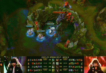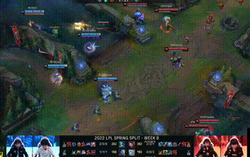 从动图中可以看出在中期装备成型后,双修的POKE流卡莎W技能伤害非常可观,对方C位吃到两个W技能就基本丧失了正面的作战能力,并且在拉扯期间,W技能很容易命中抱团的敌方,这种毫无代价的消耗能力是任何其他英雄不具备的。
