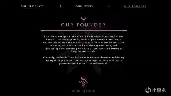 出身于卑微的祖安污水区(sump),Glasc工业创始人Renata Glasc受她家族炼金工业成果的启发,以改善祖安和皮尔特沃夫的生活。在过去30年里,她的工作涉及城市发展、科技和慈善事业,并同时与市民和化学巨头合作,以确保街道安全。