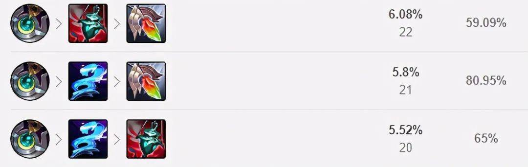 翠神的装备以辅助装为主。月石再生器能够为队友回血,提供源源不断的持续作战能力。香炉和救赎是传统的软辅两件套,能够更好的保护队友。流水法杖对于翠神来说也十分好用,在提供护盾或治疗时,能增加自身和队友移速和法强。