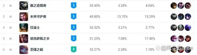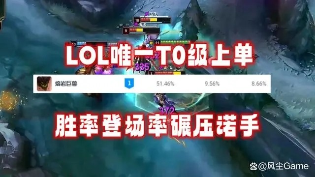 另外两个位列T1的战士,就稍微有些冷门了,狮子狗和奥拉夫的胜率,都在53.3%以上,但登场率方面,都在3.2%左右,虽然算不上冷门,但也算不上很火热,都是比较吃熟练度的存在,参考意义不是很大,而目前唯一位列T0级别的,就是石头人了,9.5%的登场率,51.4%的胜率,两项数据都超过了诺手,妥妥的混分巨兽。