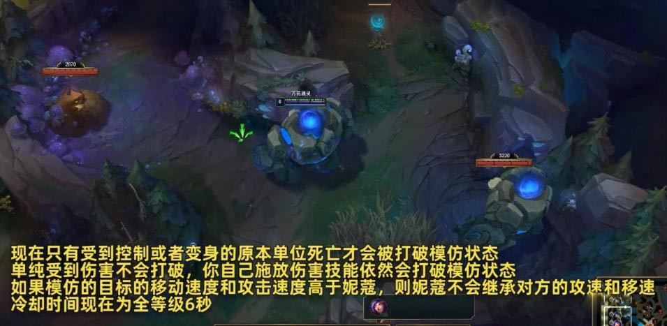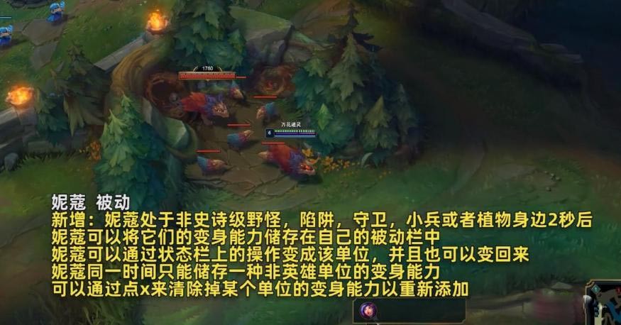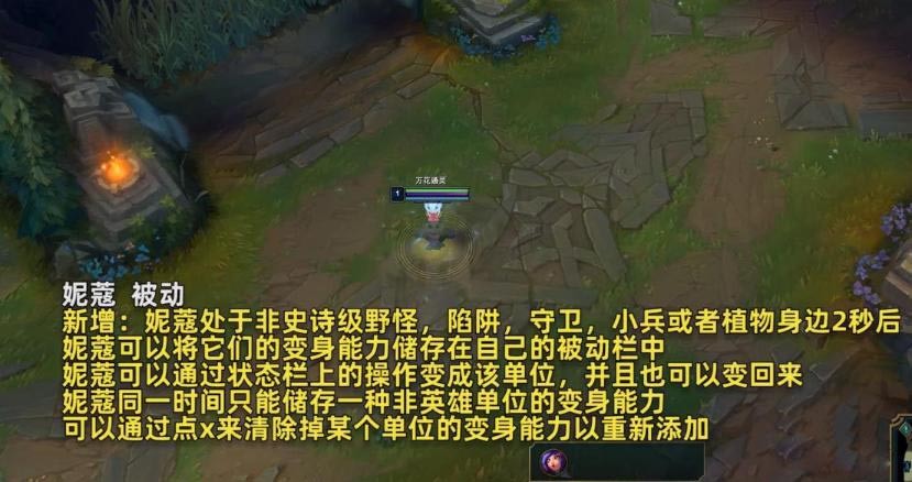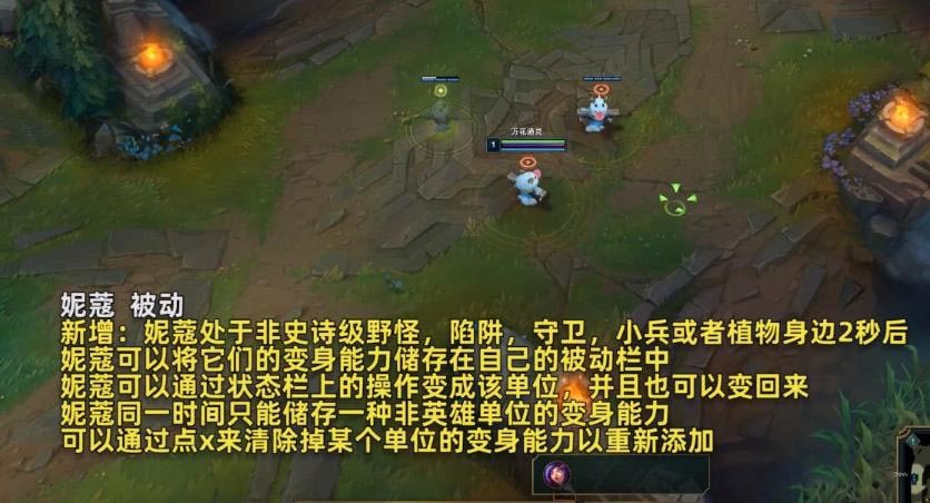 新增:妮蔻处于非史诗级野怪,陷阱,守卫,小兵或者植物身边2秒后,妮蔻可以将它们的变身能力储存在自己的被动栏中。