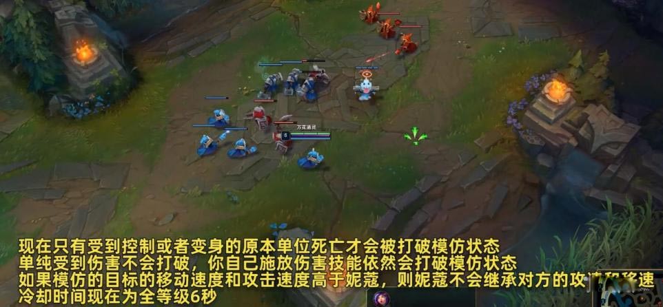 如果模仿的目标的移动速度和攻击速度高于妮蔻,则妮蔻不会继承对方的攻速和移速,冷却时间现在为全等级6秒。