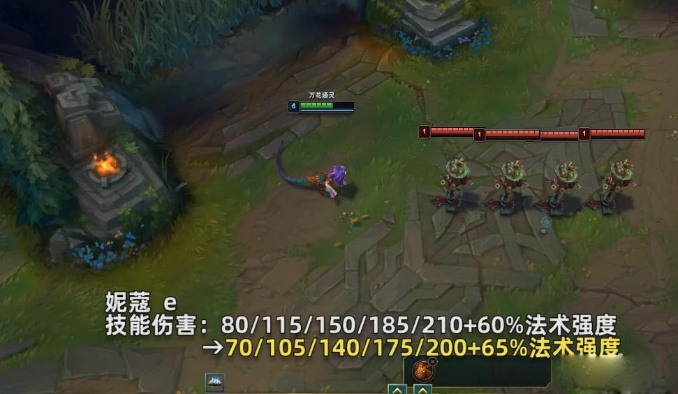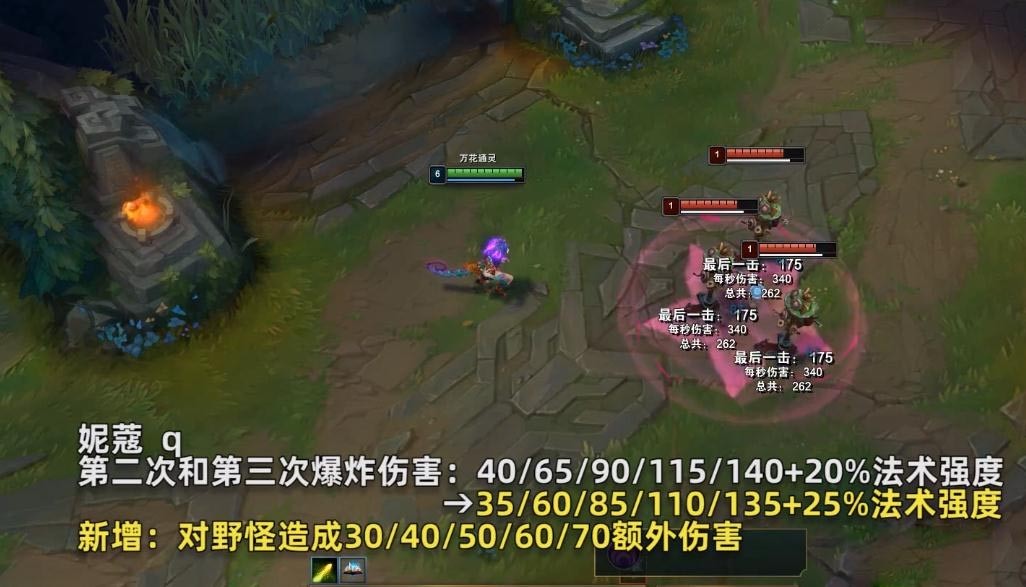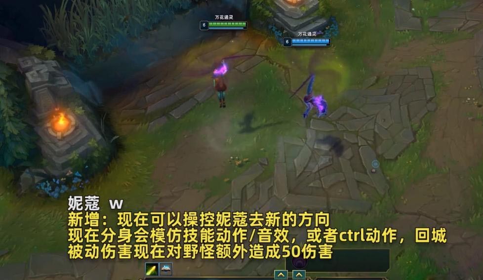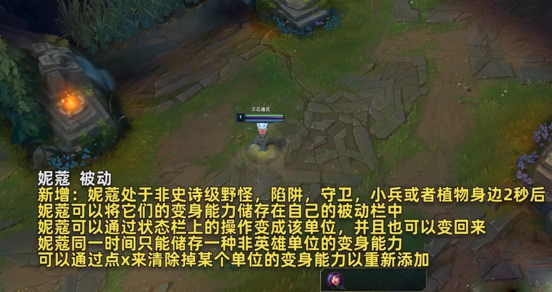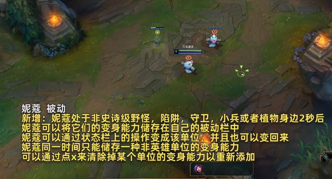 新增:妮蔻处于非史诗级野怪,陷阱,守卫,小兵或者植物身边2秒后,妮蔻可以将它们的变身能力储存在自己的被动栏中。