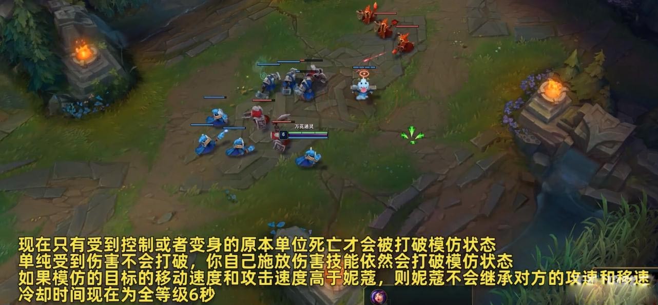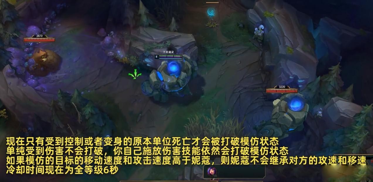 如果模仿的目标的移动速度和攻击速度高于妮蔻,则妮蔻不会继承对方的攻速和移速,冷却时间现在为全等级6秒。